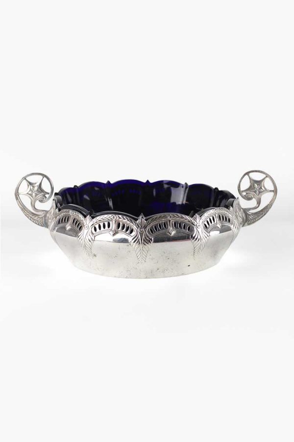 12 Sided Embossed Silver & Blue Glass Dish with Scroll & Star Handles & Scalloped Rim