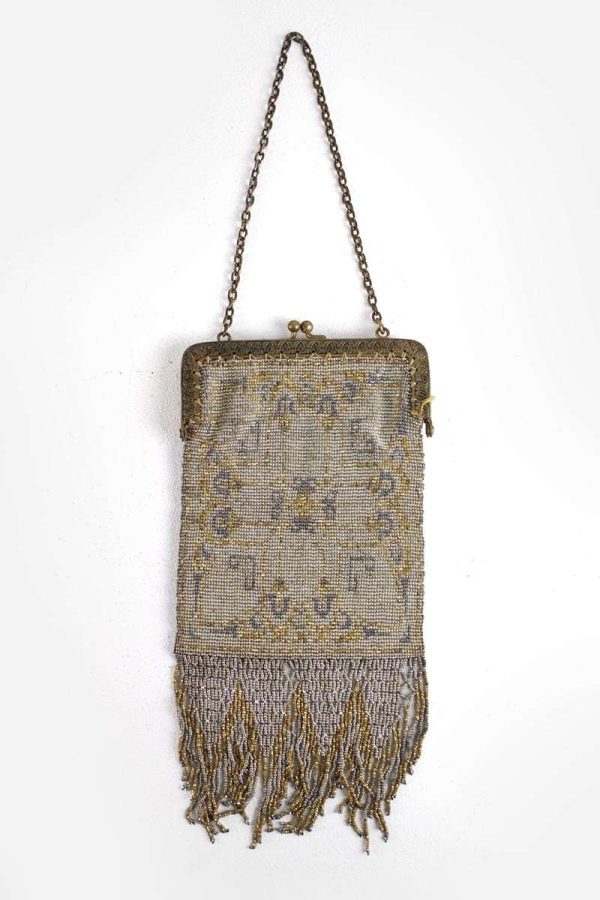 1920s Small Beaded Evening Handbag with Beaded Fringe in Bronze and Gold Decoration with Chain Handle