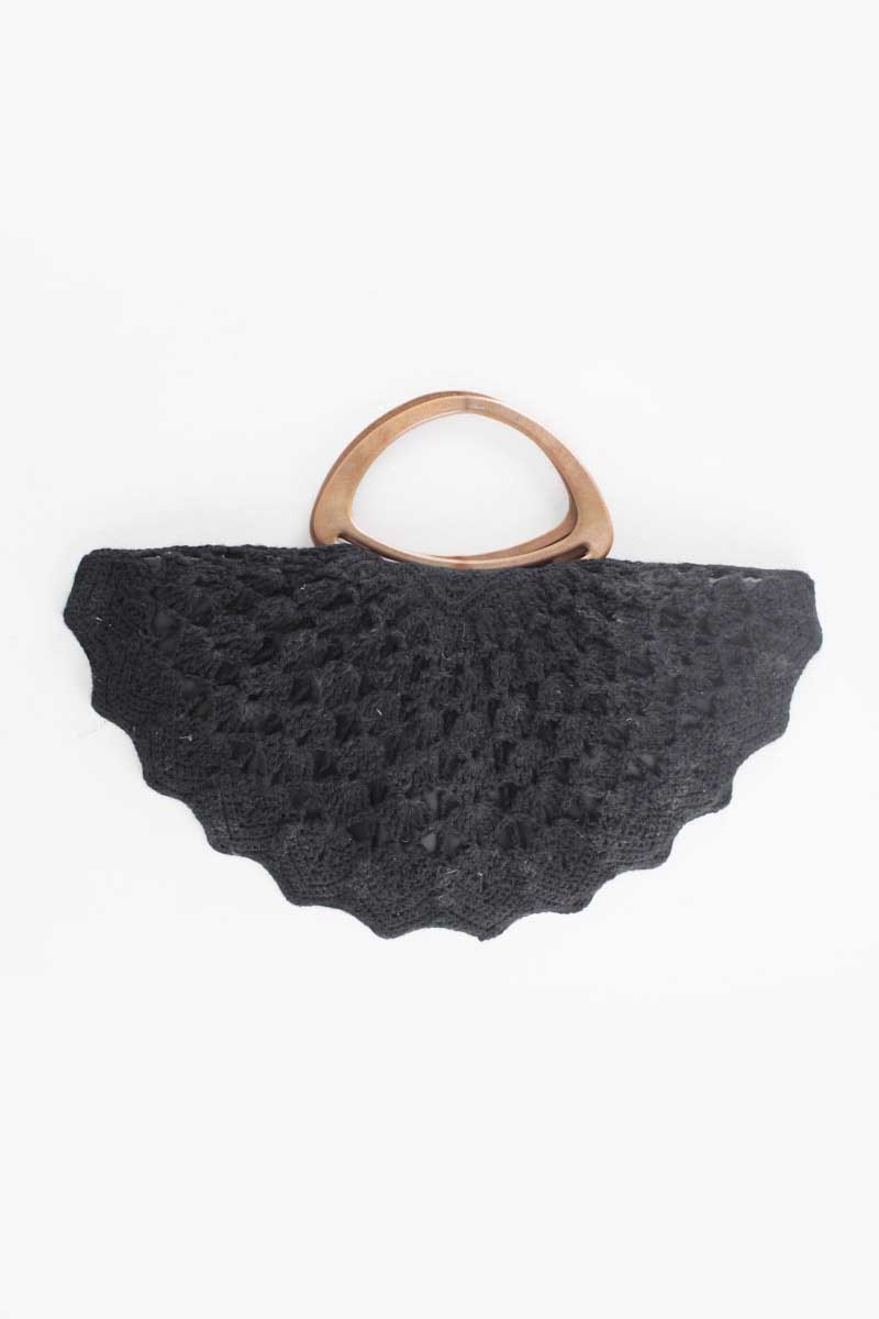 1940s Black Knitted Half Moon Handbag with Wooden Handles