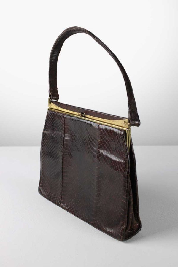 1930s – 1940s Brown Snake Skin Handbag with Brown Satin Lining