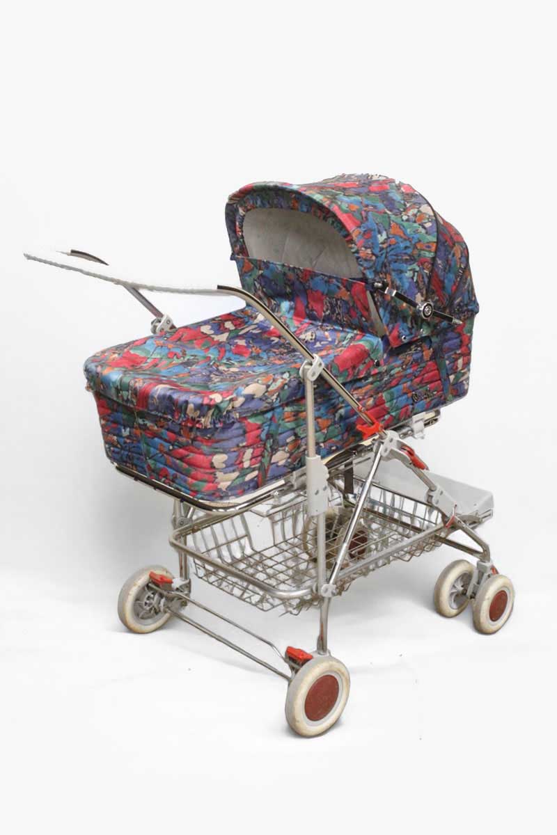 1980s Multicoloured Silver Cross Pram In Red Blue and Green Pattern