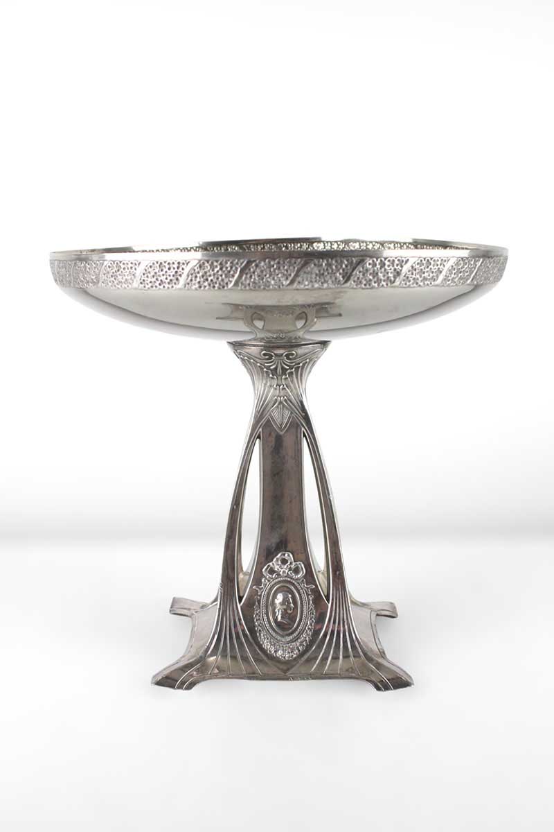 art Nouveau Circular Silver Tazza Embossed Floral Rim with Multi Stem Rectangular Base with Swag Bow & Head Decoration