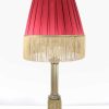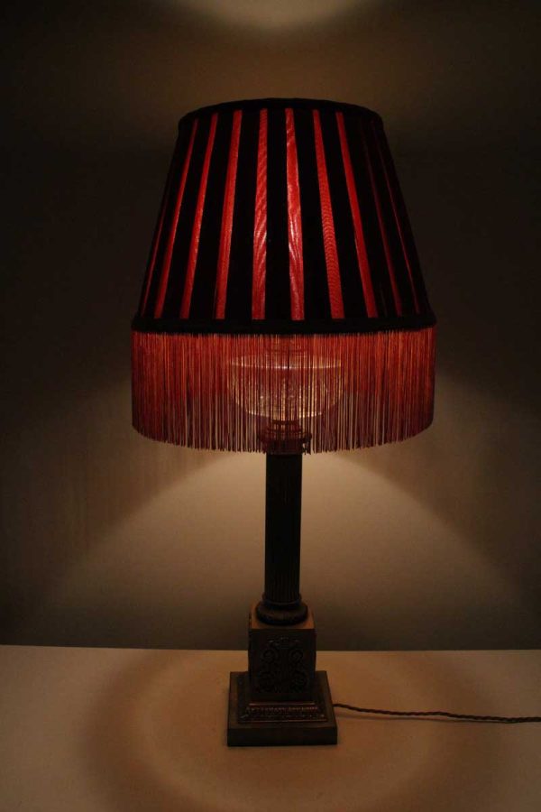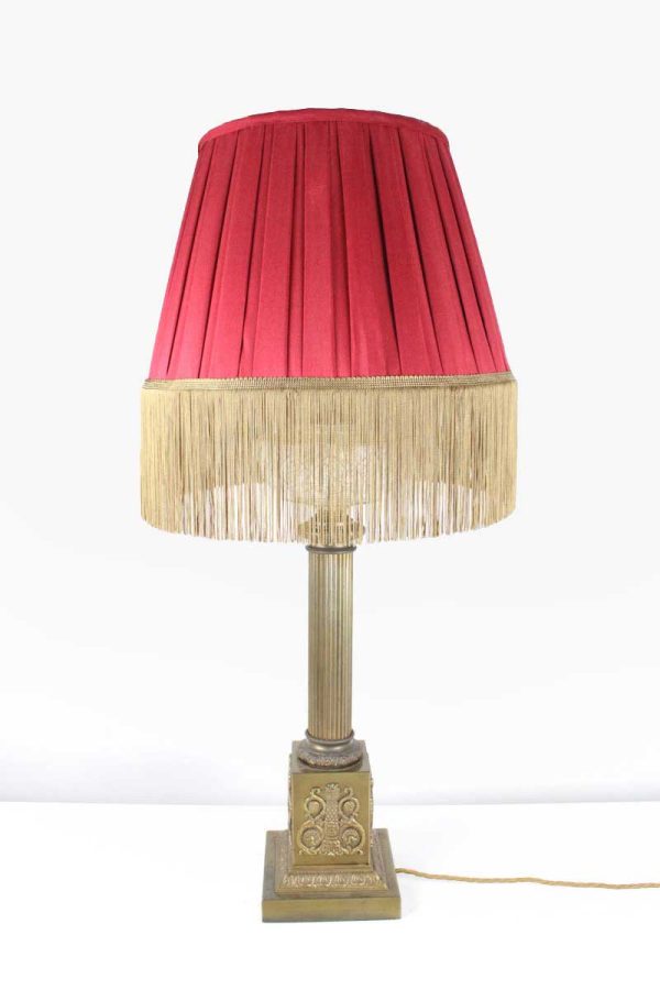 Bronze Corinthian Column Converted Oil Table Lamp with Glass Font and Red Pleated Shade with Bronze Long Fringe quantity