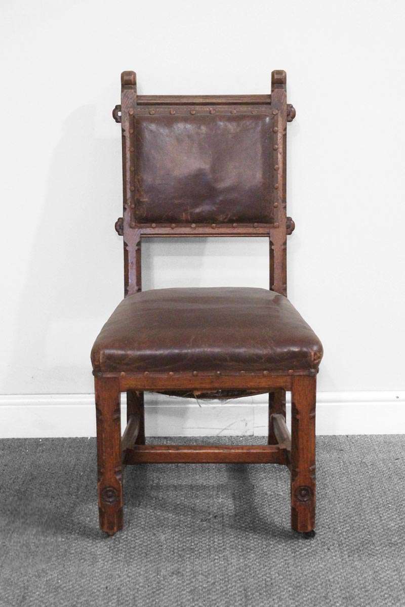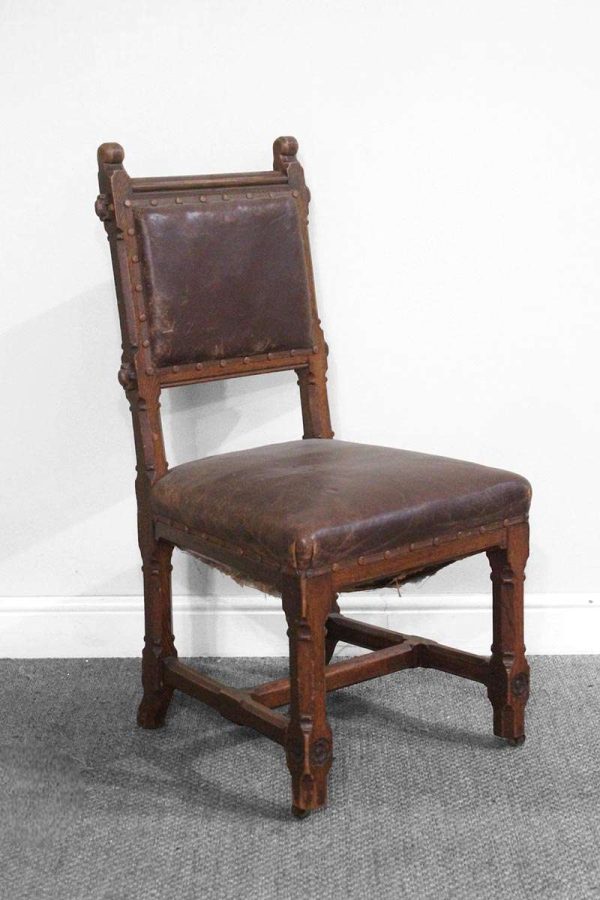 Brown Distressed Leather Upholstered Chair with Stud Detail and Front Castors