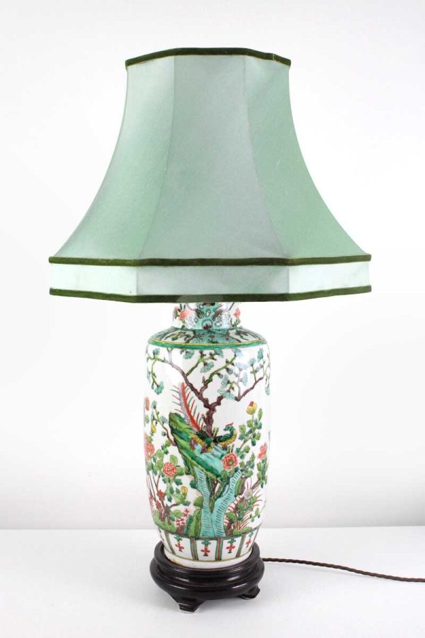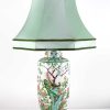 Chinese Ceramic Garden Scene Table Lamp with Green Bowed Shade and Velvet Trim