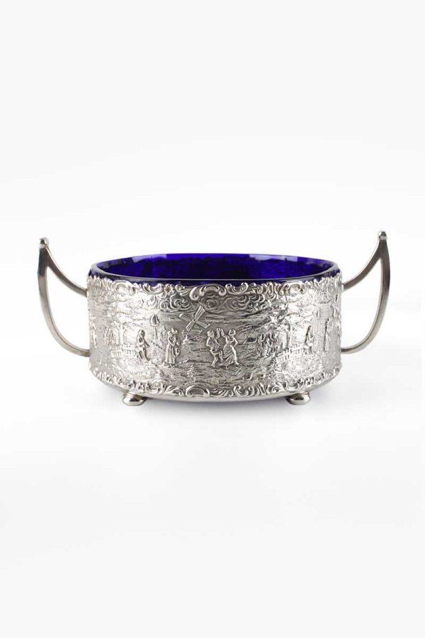 Circular Embossed Silver & Blue Glass Dish with Country Scenes & 2 Pointed Handles on 4 Bun Feet