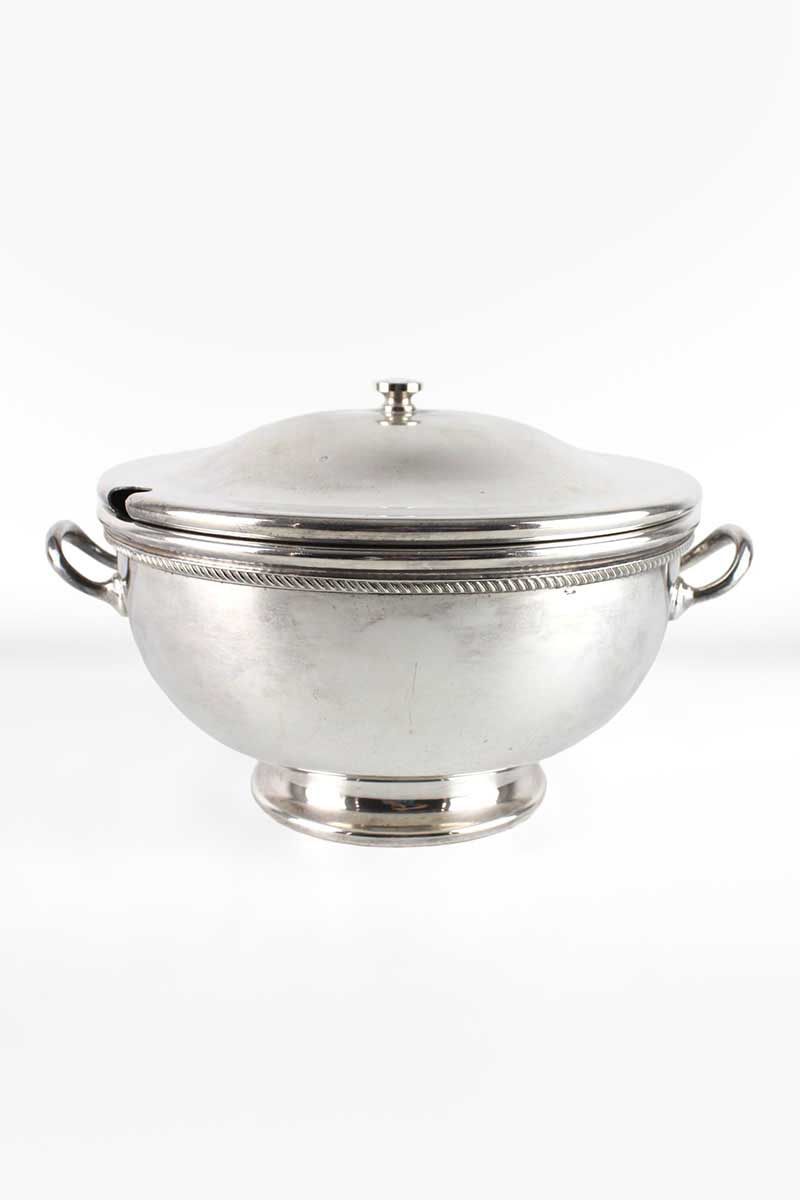 Circular Plain Silver Soup Tureen with Gadroon Band, 2 Curved Handles, Plain Lid & Knob