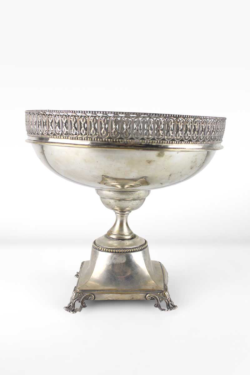 Circular Silver Comport Bowl with Pierced & Bead Gallery on a Square Base with 4 Scroll Leaf Feet