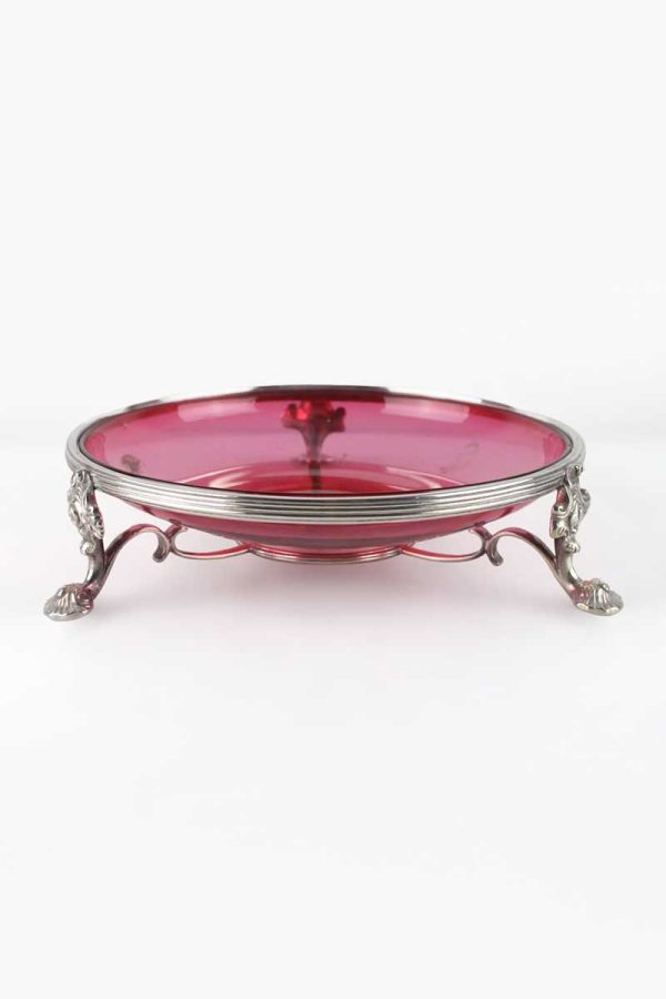 Circular Silver & Cranberry Glass Dish on 3 Legged Stand with Ribbed Rim