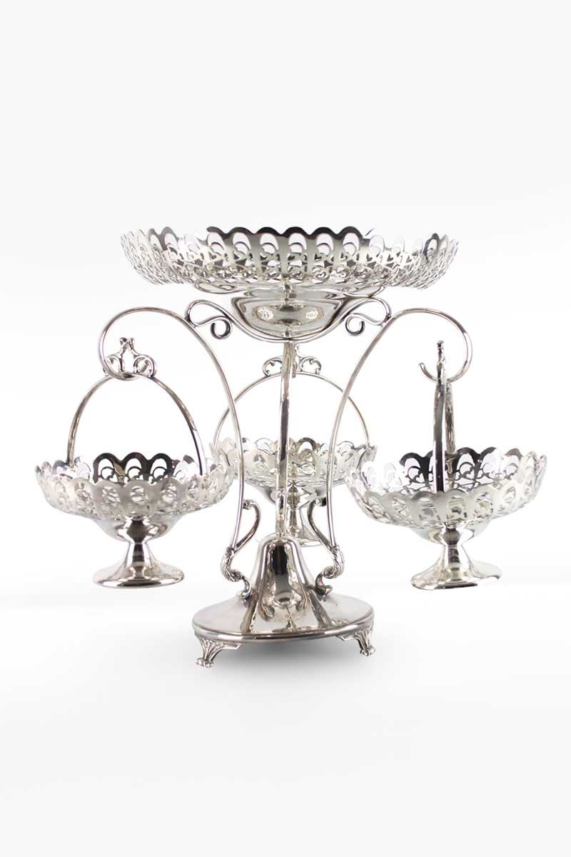 Circular Silver Epergne Centrepiece with 3 Fretwork Silver Hanging Baskets and Top