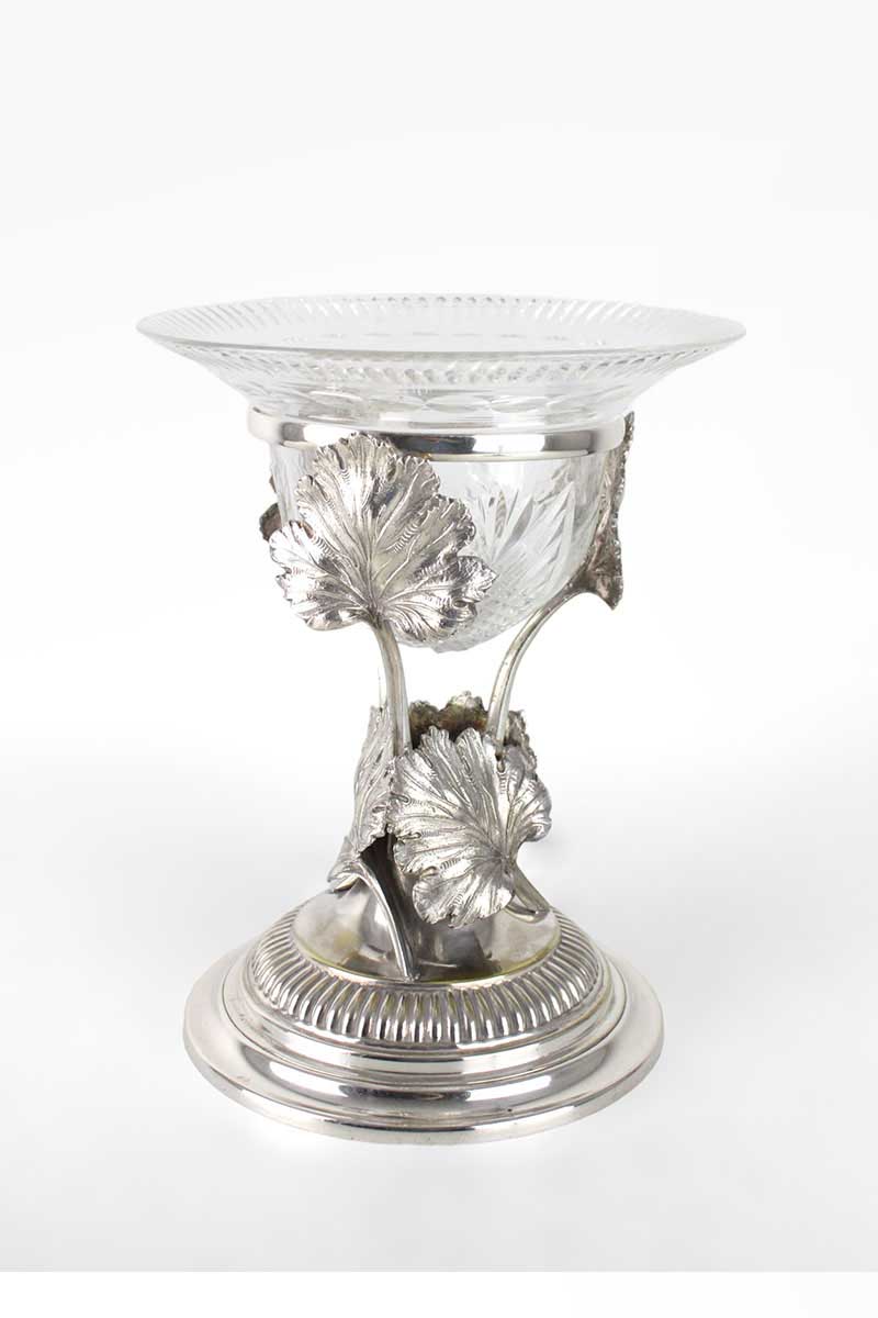 Circular Silver Epergne Centrepiece with 3 Large Moulded Leaf Supports and Deep Cut Glass Bowl