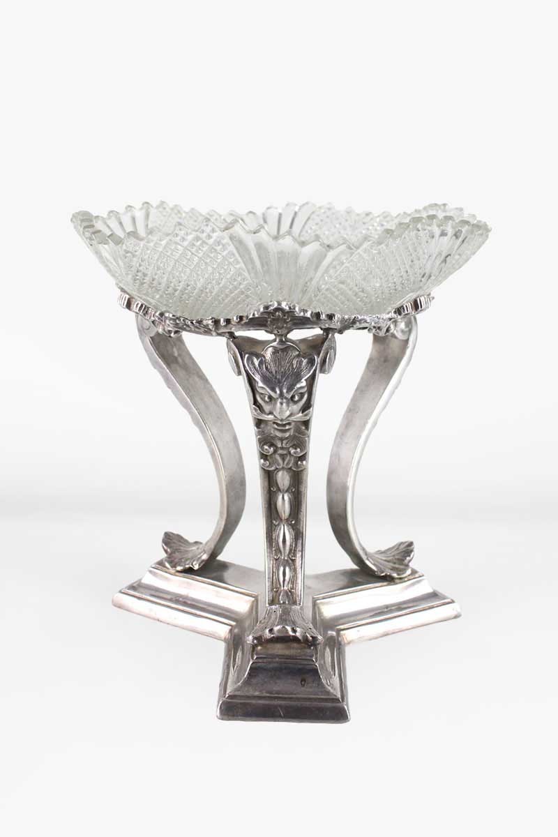 Circular Silver Epergne Centrepiece with 3 Mask & Scroll Leaf Supports on Triform Foot with Wavy Edged Cut Glass Dish