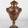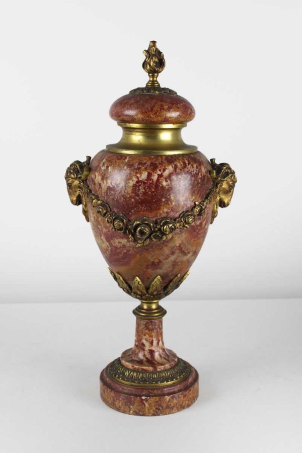 Dark Orange / Red Marble Lidded Urn with Bronze Garlands and Rams Heads with Flame Finial