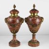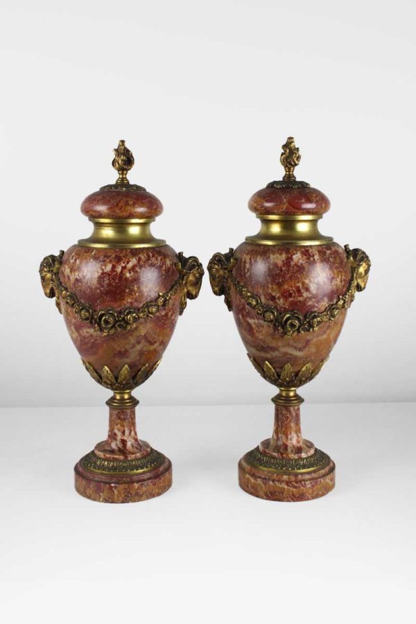 Dark Orange / Red Marble Lidded Urn with Bronze Garlands and Rams Heads with Flame Finial quantity