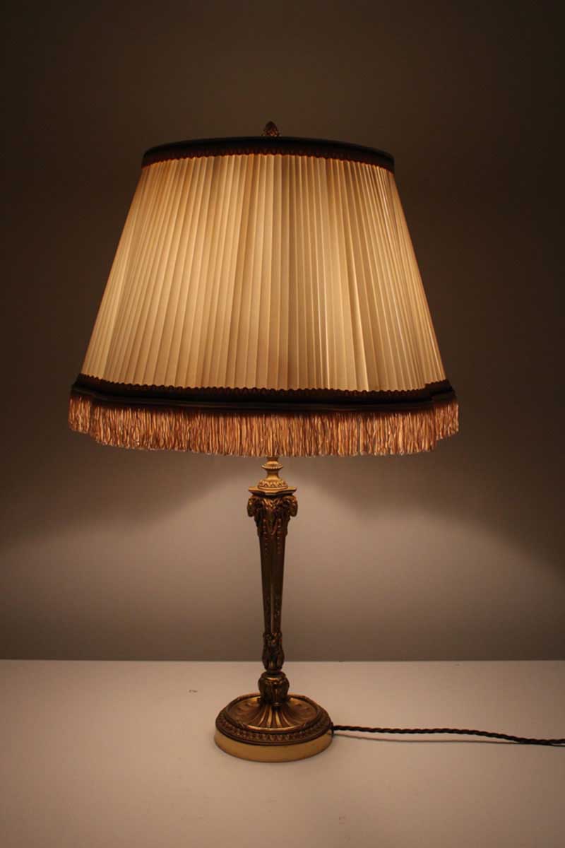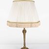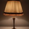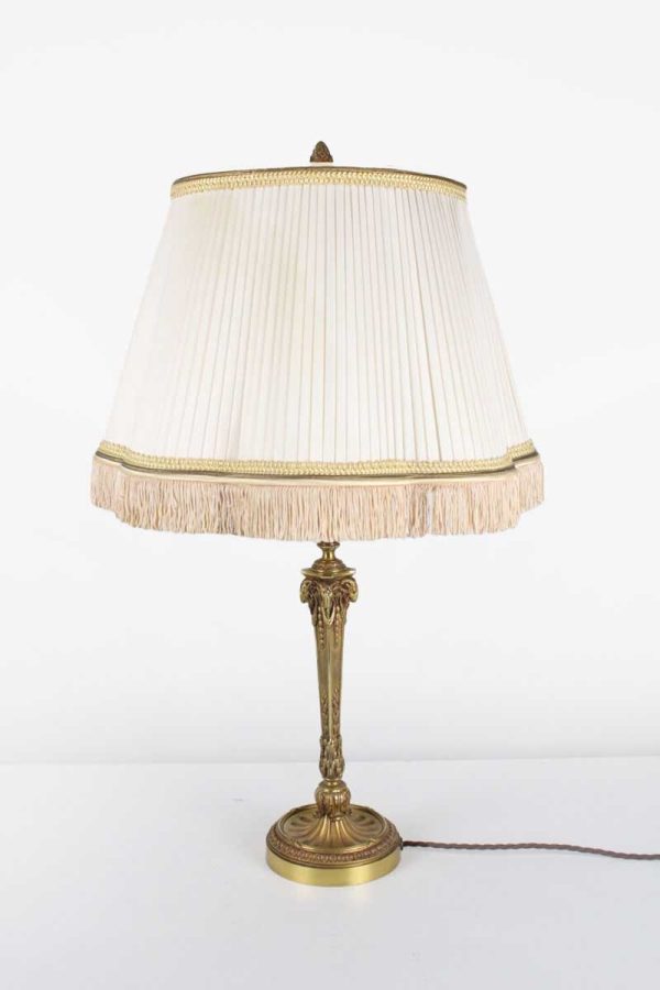 Decorative Brass Table Lamp with Circular Base and Cream Scalloped Pleated Shade with Fringe quantity