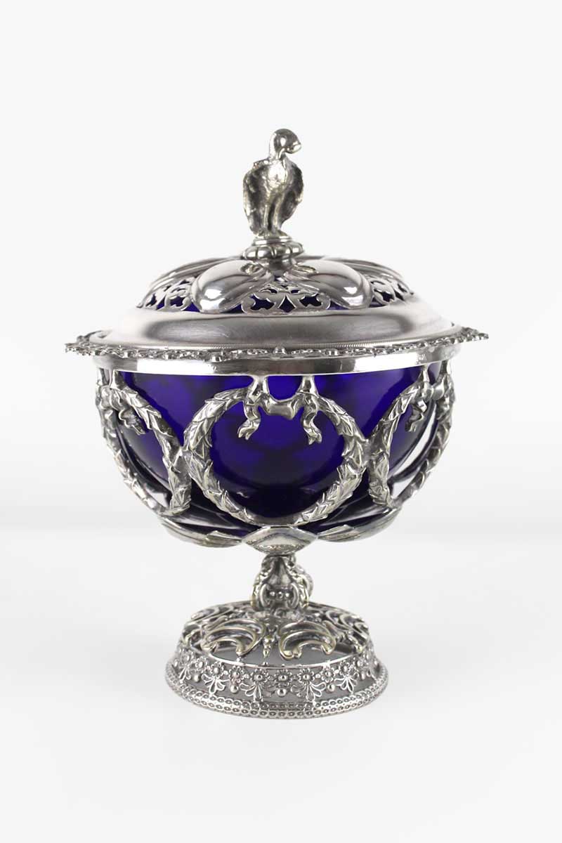 Decorative Pierced Wreath Bon Bon Dish & Lid with Blue Glass Liner