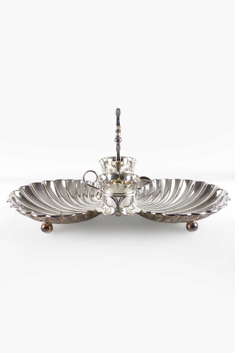 Double Sided Shell Shaped Silver Strawberry Dish with Ring Handle & Cream Jug & Sugar Bowl