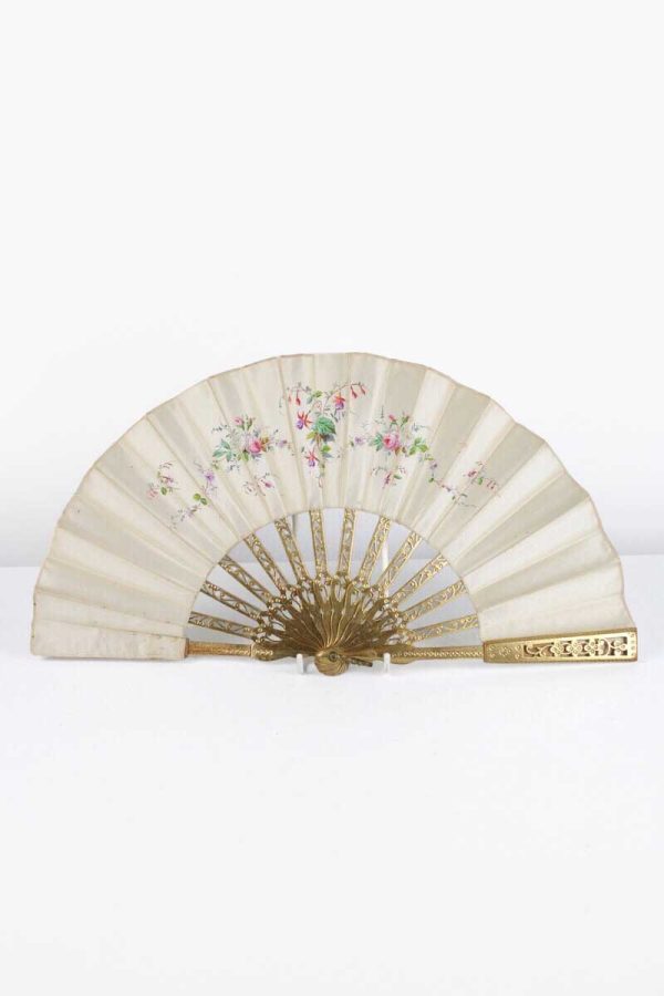 Gilt Wood Filigree Fan with Cream Silk Mount Hand Painted with Flowers