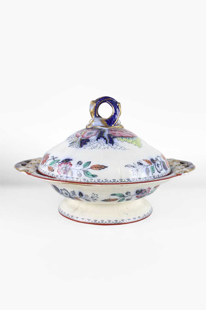 Ironstone Flying Bird Pattern Circular Vegetable Tureen & Lid with Fish Handles