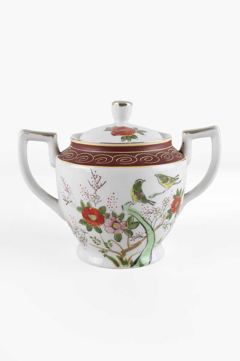 Japanese Hand Painted Porcelain Lidded Sugar Pot with Floral Branch and Birds and Brown & Gilt Swirl Rim
