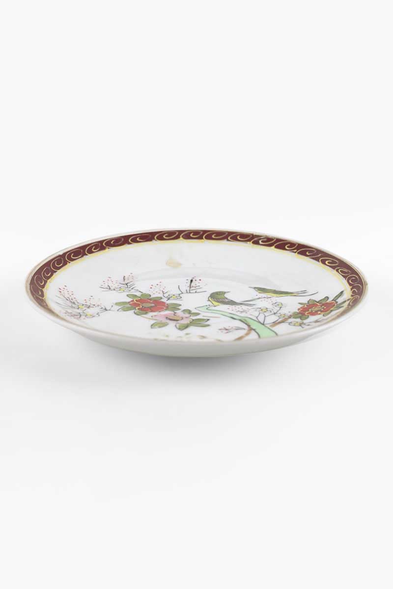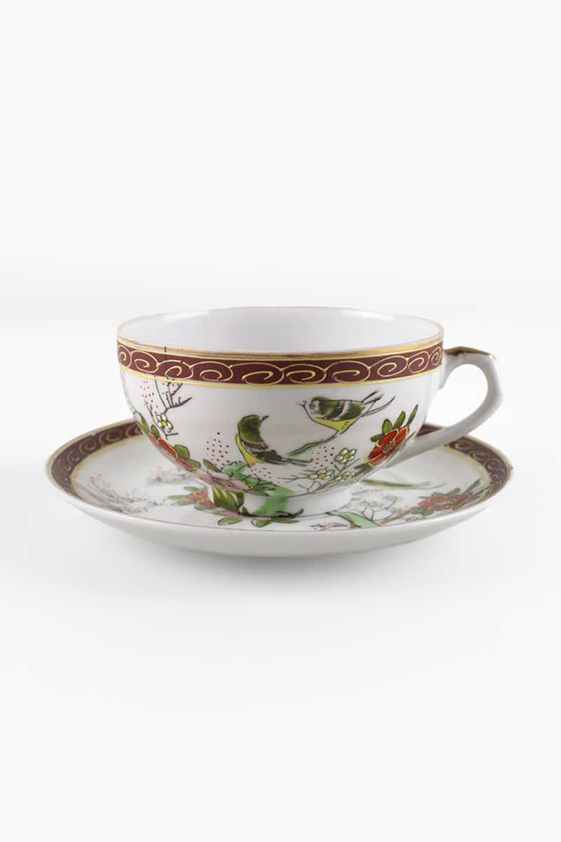 Japanese Hand Painted Porcelain Tea Cup Saucer with Floral Branch and Birds and Brown & Gilt Swirl Rim