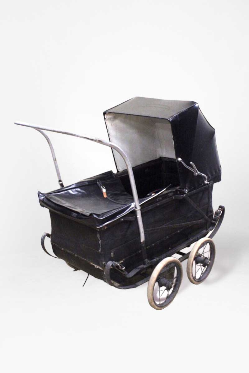 Large Black Late Edwardian – 1920s Low Pram with Black Faux Leather Canopy