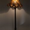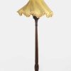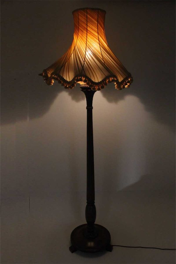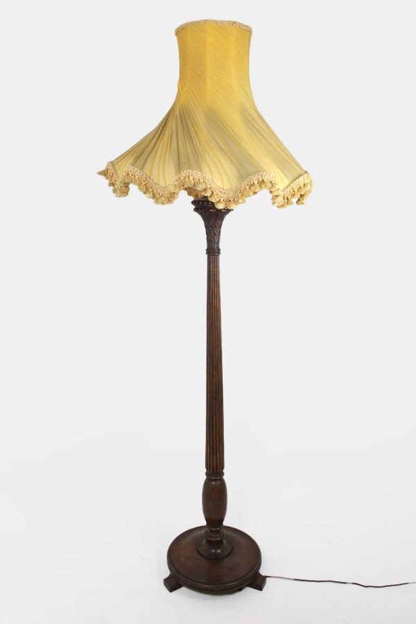 Large Carved Oak Fluted Standard Lamp with Circular Base and Large Bowed and Fluted Gold Chiffon Shade with Tassels