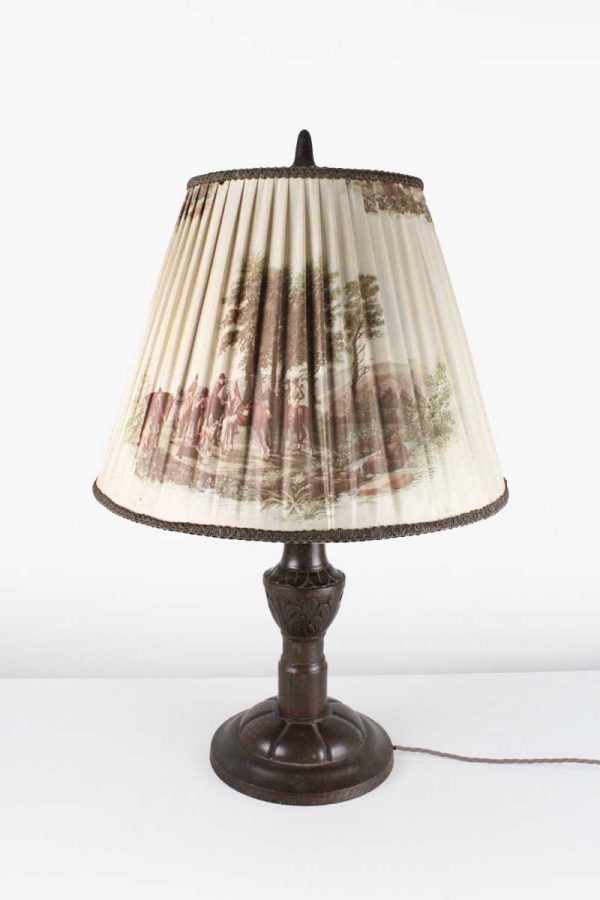 Large Carved Wood Table Lamp with Grey Silk Closed Shade Printed with Fox Hunting Scene