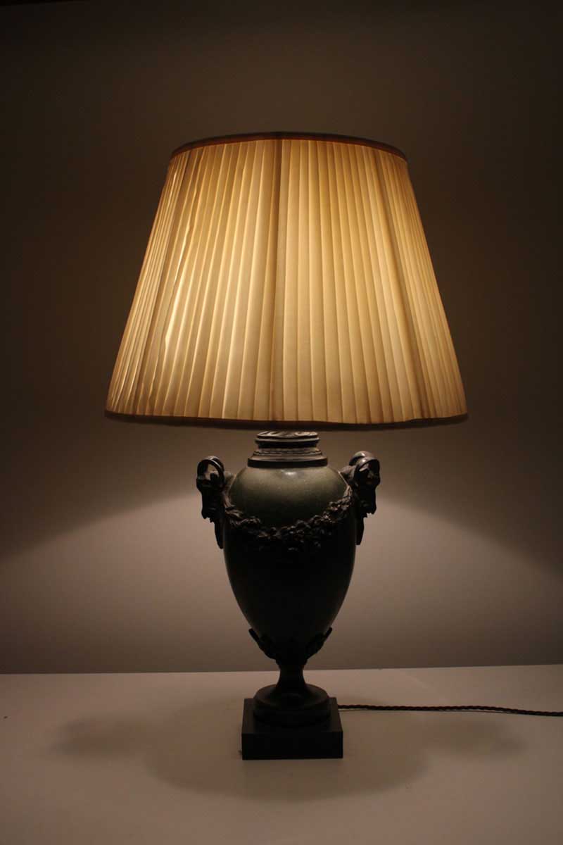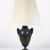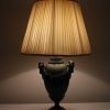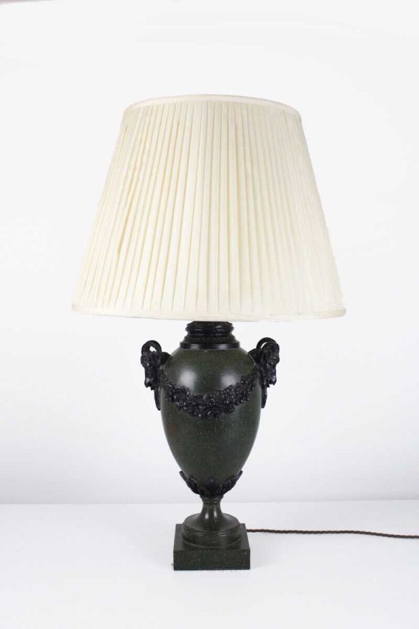 Large Dark Green Composition Marble Urn Table Lamp with Bronze Swags and Goat Masks and Cream Pleated Shade