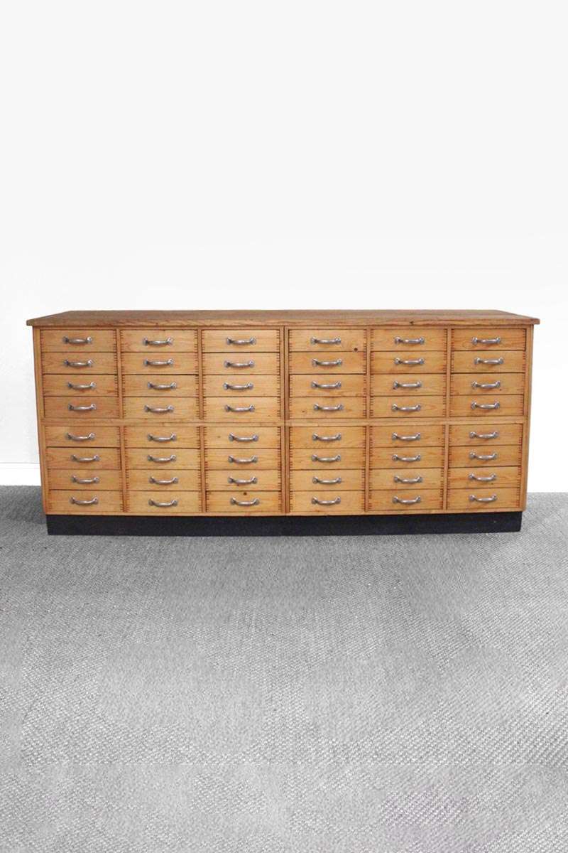 Large Stained Pine Haberdashers Shop Display Cabinet with 48 Drawers and Chrome Handles
