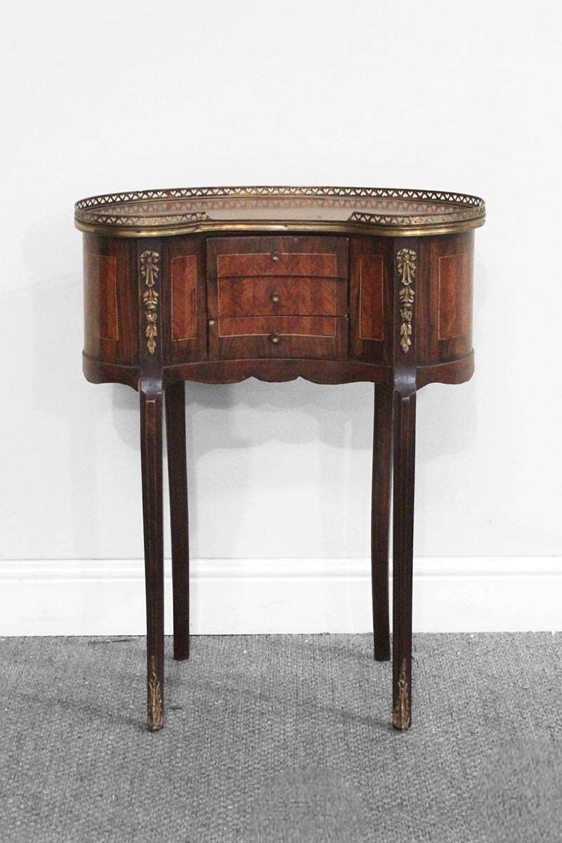 Mahogany and Marquetry inlaid Kidney Shaped Occasional Table with Brass Gallery and Relief over 3 Drawers