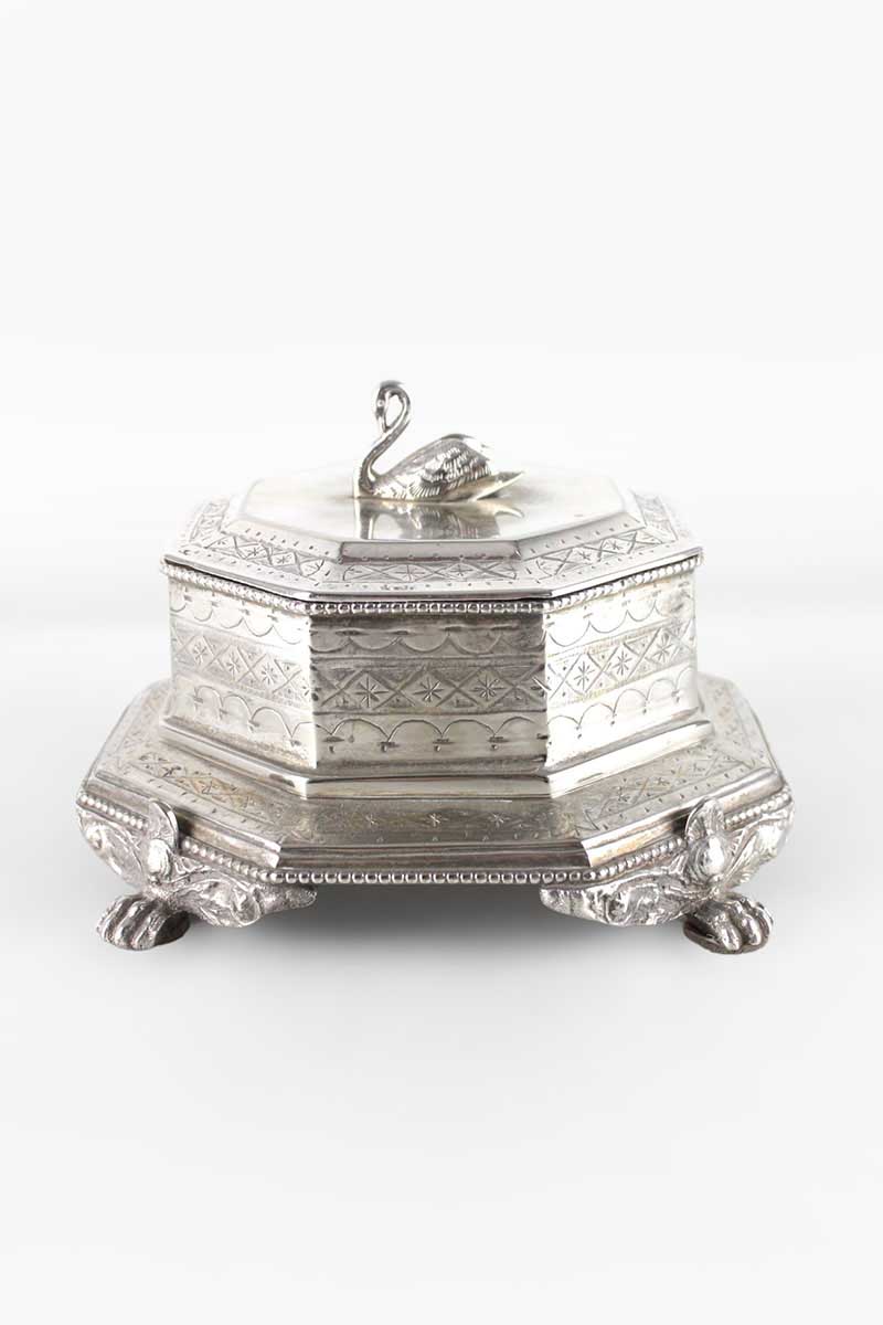 Octagonal Engraved Silver Box with Wider Base on 4 Paw Feet & Swan Knob on Lid