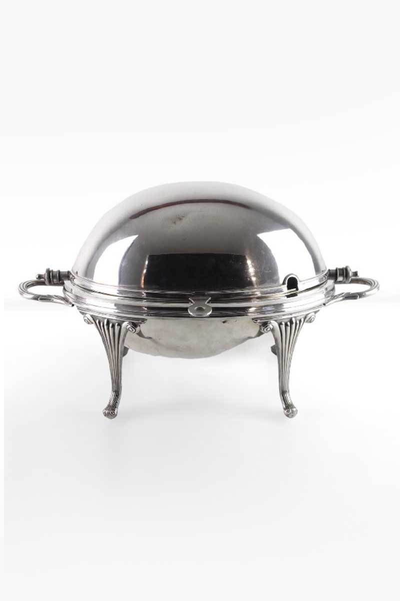 Oval Plain Silver Revolving Lid Breakfast Dish with Ribbed Legs & Handles, Liner & Drainer