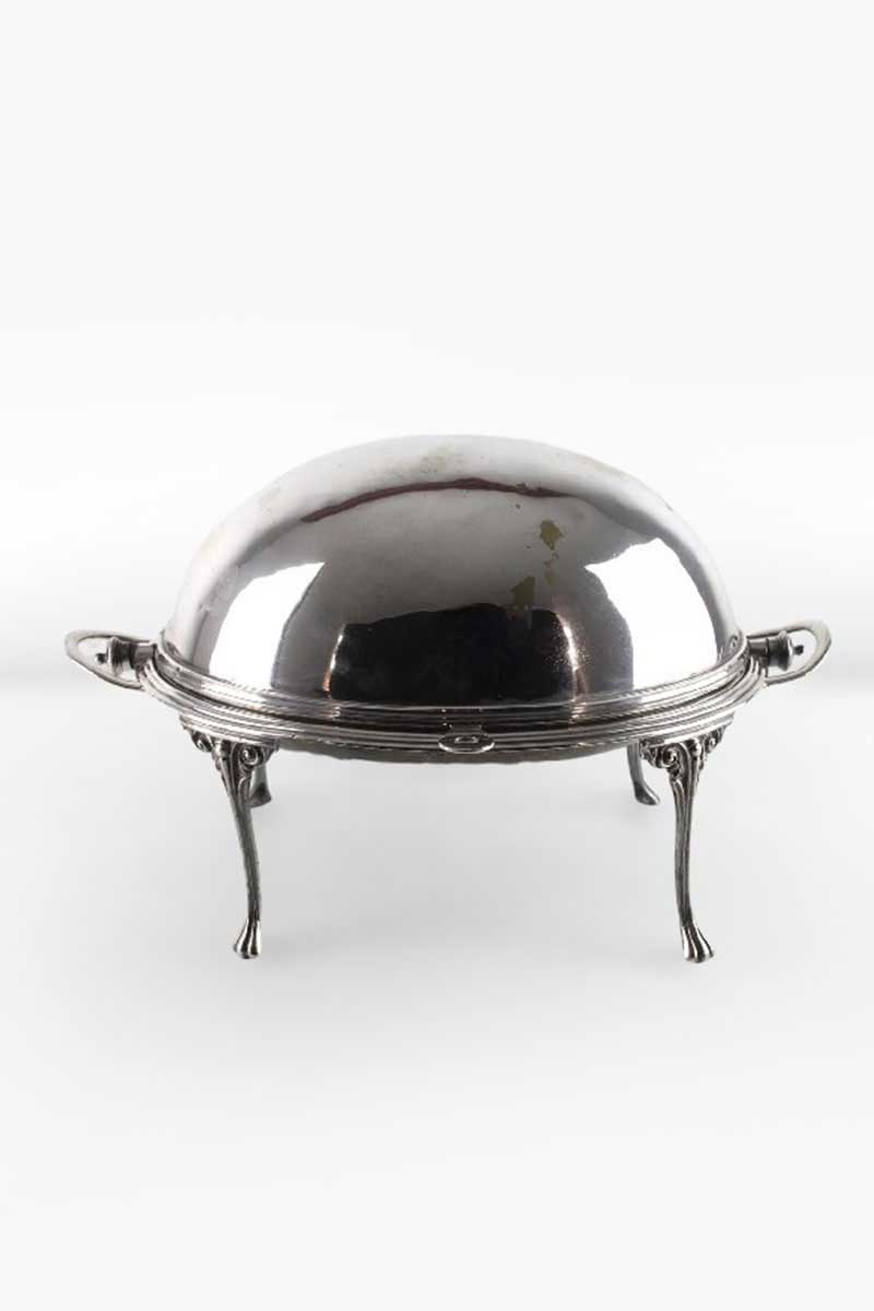 Oval Plain Silver Revolving Lid Breakfast Dish with Ribbed Legs, Liner & Drainer