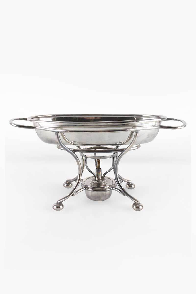 Oval Plain Silver Serving Dish on Bent Rod Stand on 4 Bun Feet with Burner