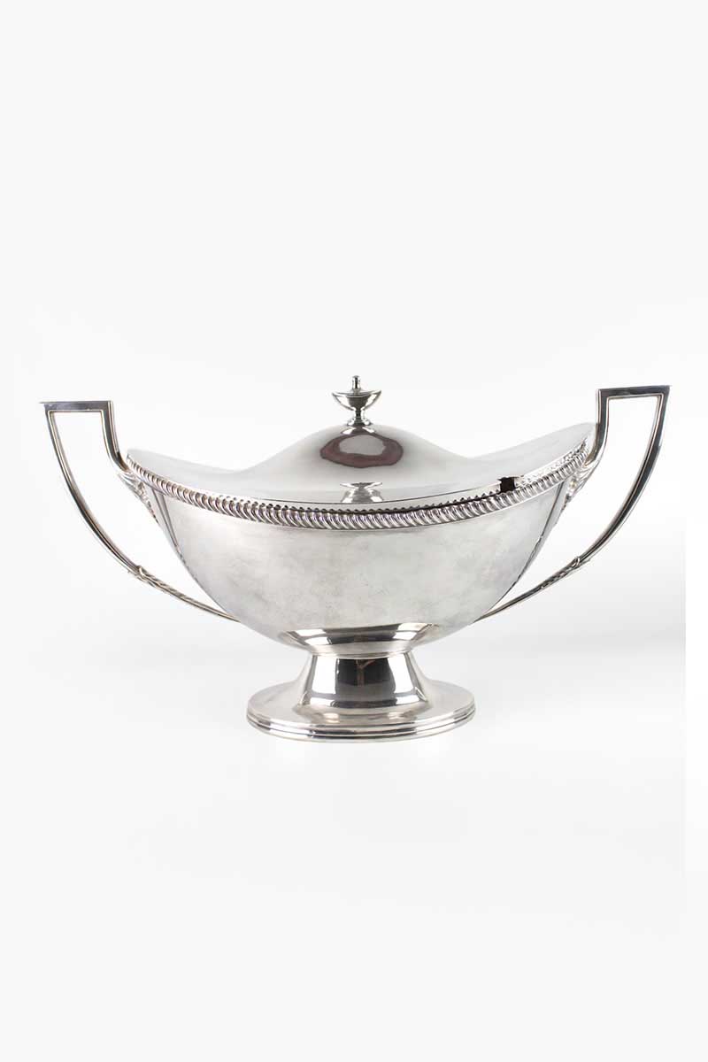 Oval Plain Silver Soup Tureen with Curved Gadroon Rim angular Handles & Plain Lid
