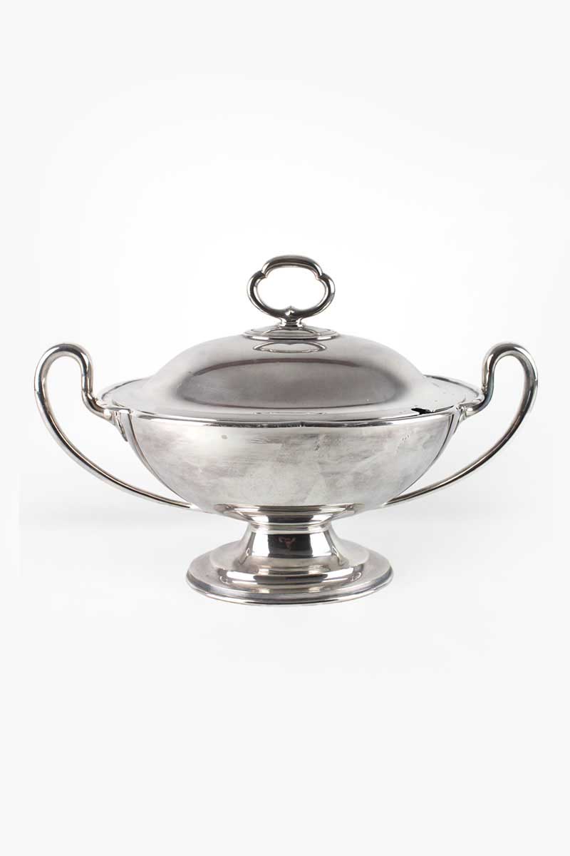 Oval Plain Silver Soup Tureen with Scalloped Rim Curved Handles & Plain Lid