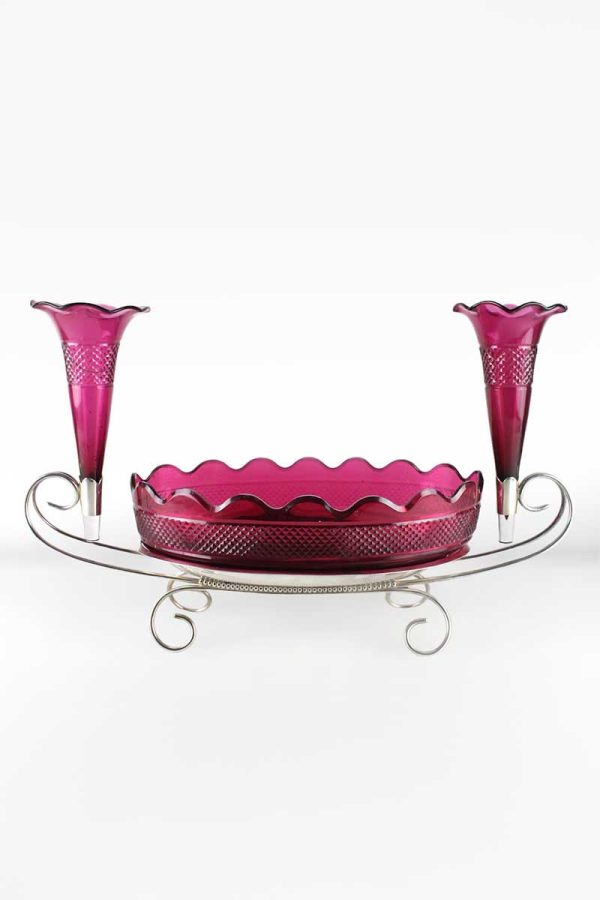 Oval Silver & Cranberry Glass Epergne Centrepiece with Oval Dish & 2 Trumpet Posy Vases on Scroll Stand