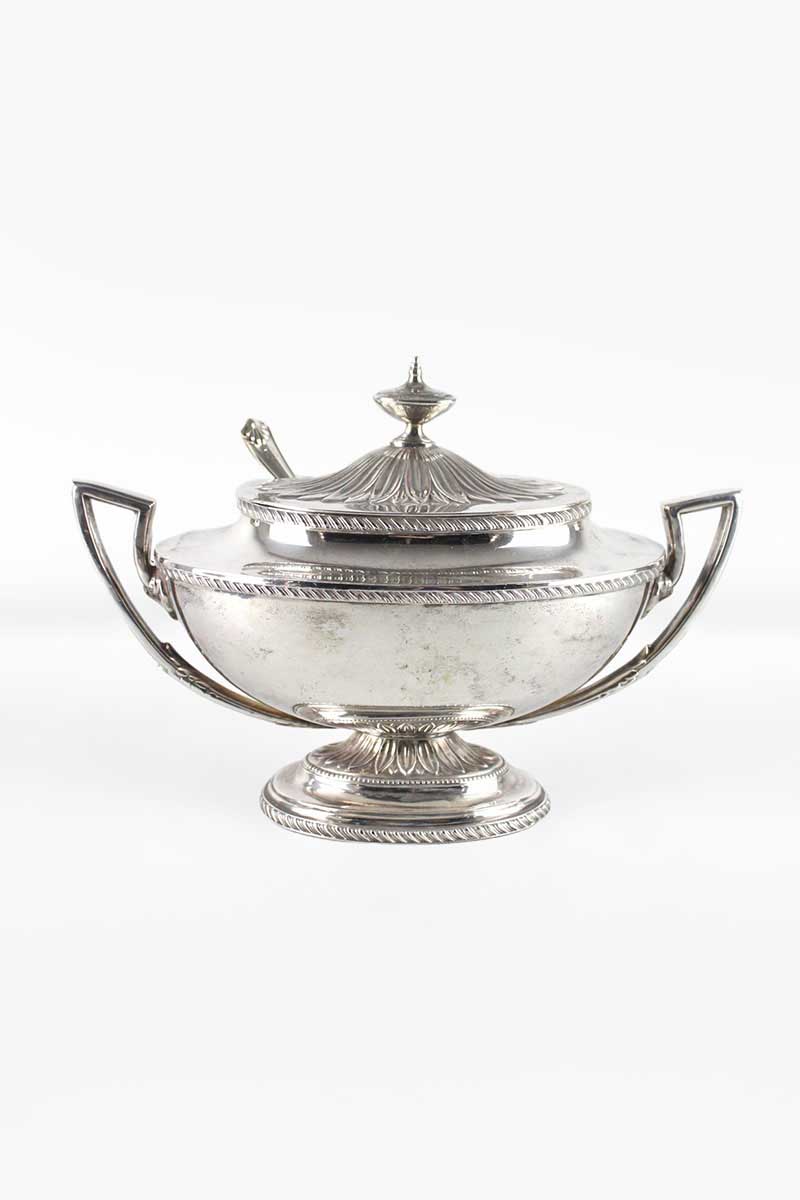 Oval Silver Sauce Tureen with Gadroon Rim Embossed Leaf Foot & Lid & Shell End Spoon