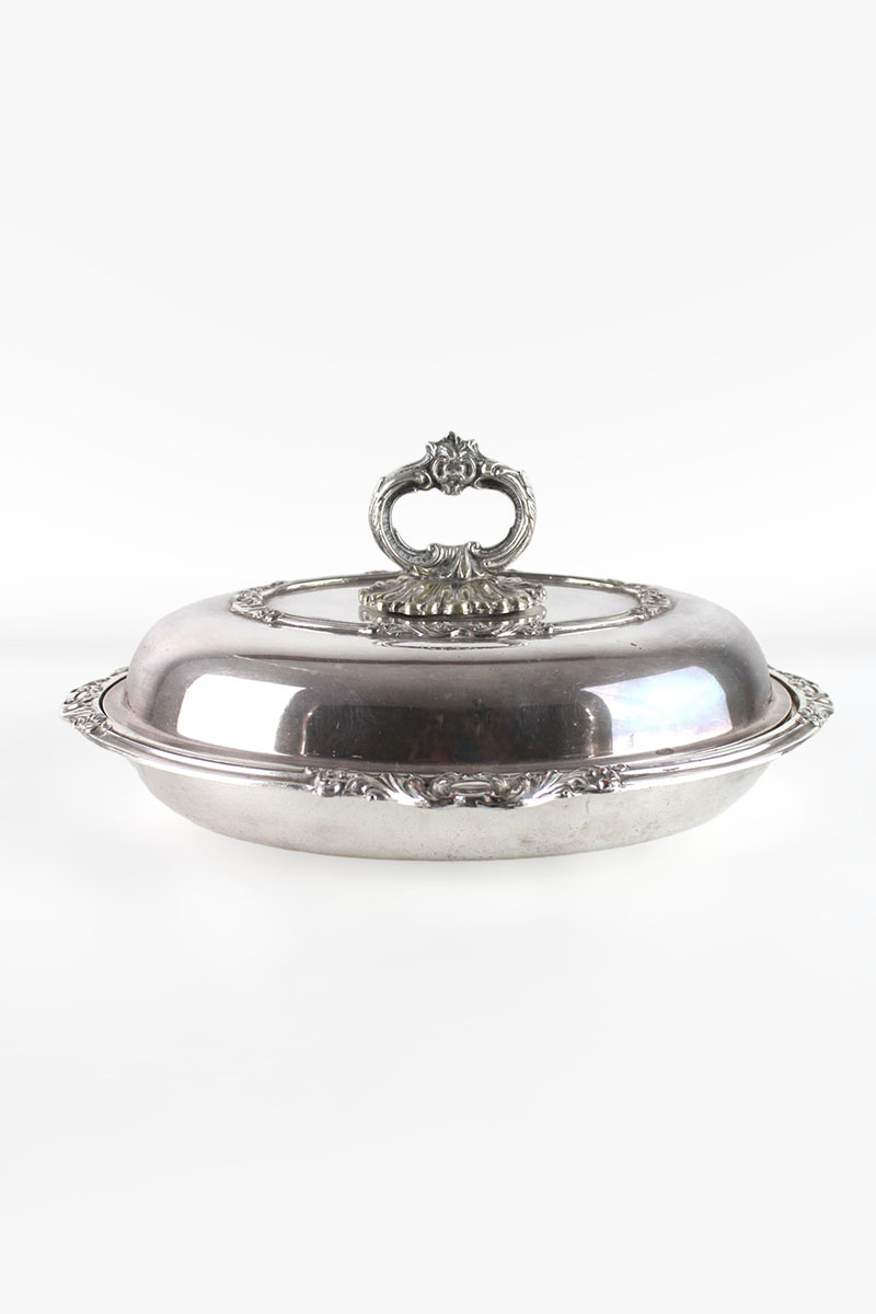 Oval Silver Serving Dish with Scroll Leaf & Reed Rim Lid & Handle