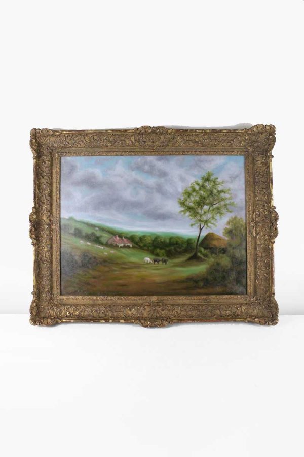 English Landscape Oil Painting with Country Lane and Cows in Carved Gilt Frame