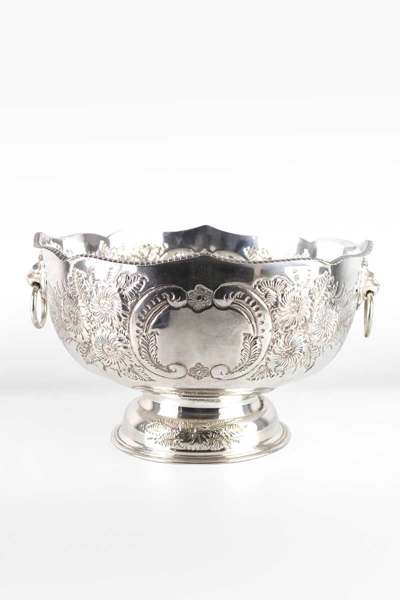 Punch Bowl with Ornate Chased Floral and Scroll Details and Lion Handles
