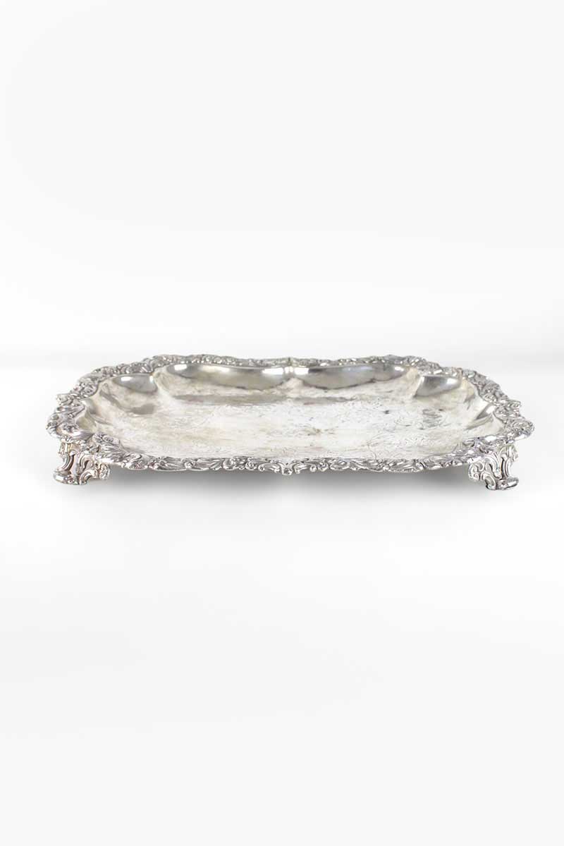 Rectangular Engraved Silver Salver / Tray Scalloped Edge with Heavily Moulded Scroll Leaf Rim