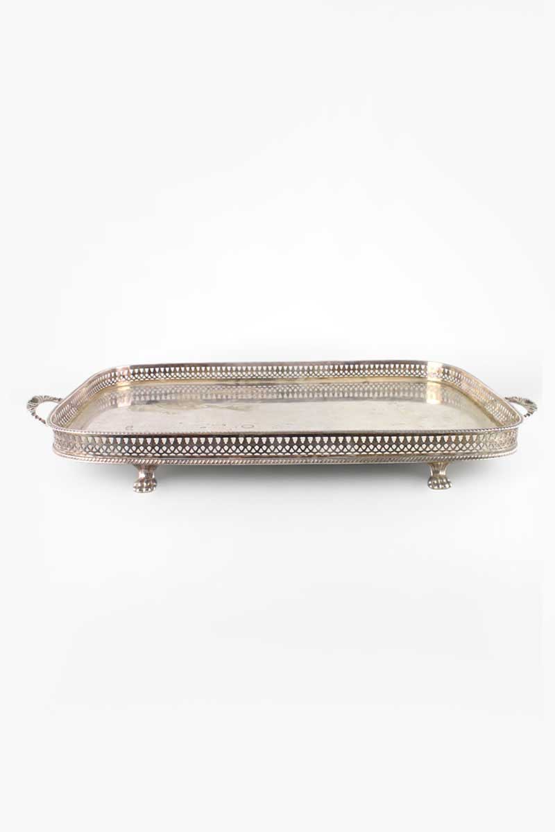 Rectangular Plain 2 Handled Silver Plated Tray with Fretwork Gallery & Gadroon Rim on Paw Feet