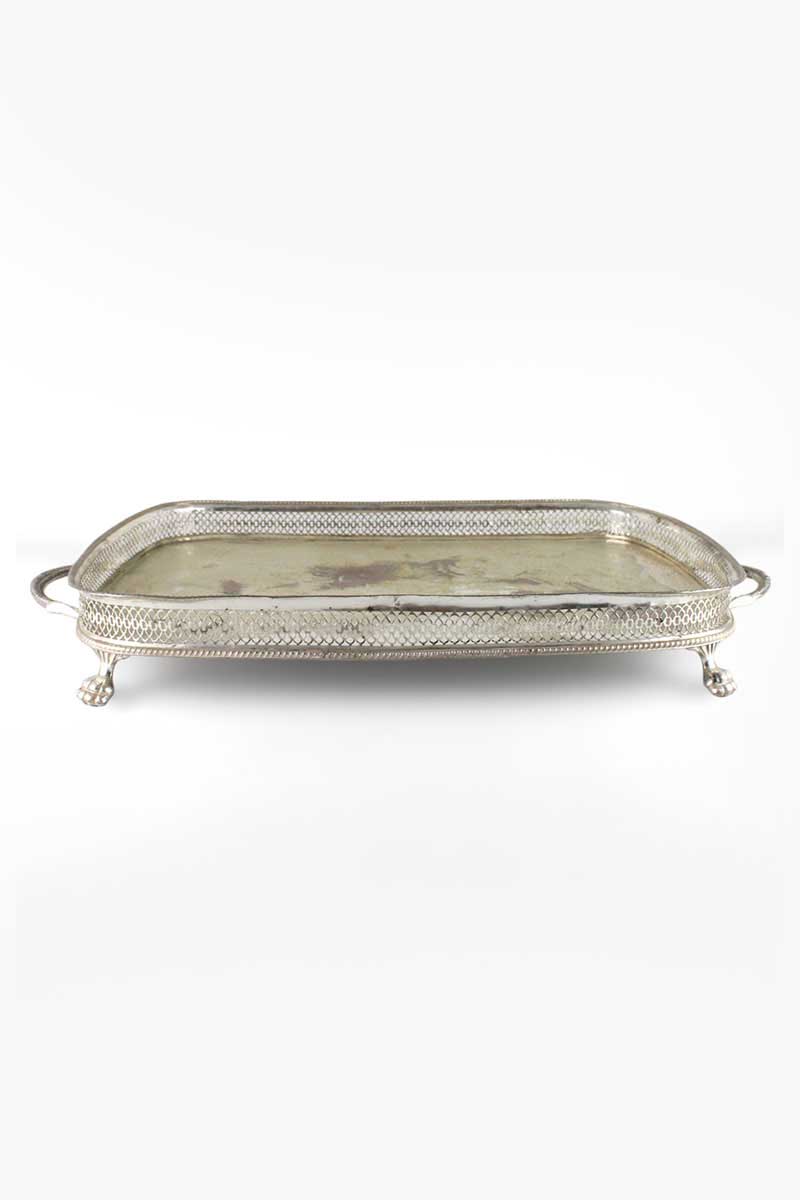 Rectangular Plain Silver Tray Fretwork Gallery Gadroon Rim & 2 Handles on 4 Legs