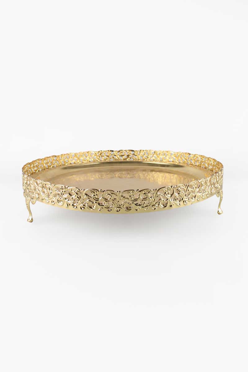 Round Engraved Gold Tray Raised Pierced Sides on 3 Feet quantity
