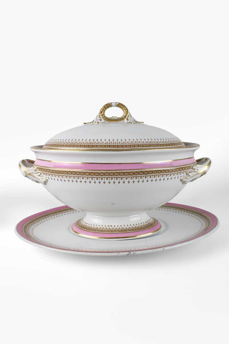 Royal Worcester Pink & Gold Rimmed Soup Tureen with Lid and Plate