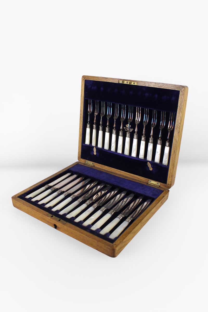 Set Of 24 Mother Of Pearl Handle Fruit Knives & Forks in a Light Oak Case