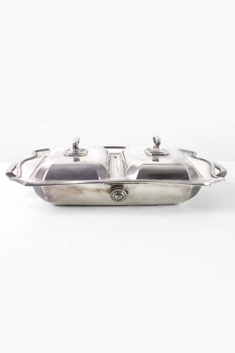 Shaped Rectangular Silver Warmer Twin Serving Dish with Reeded Rim & Handles & 2 Lids