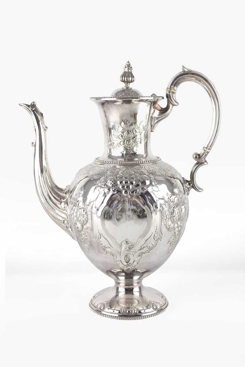 Silver Coffee Pot Bulbous Body Beautifully Embossed with Fruit & Flowers